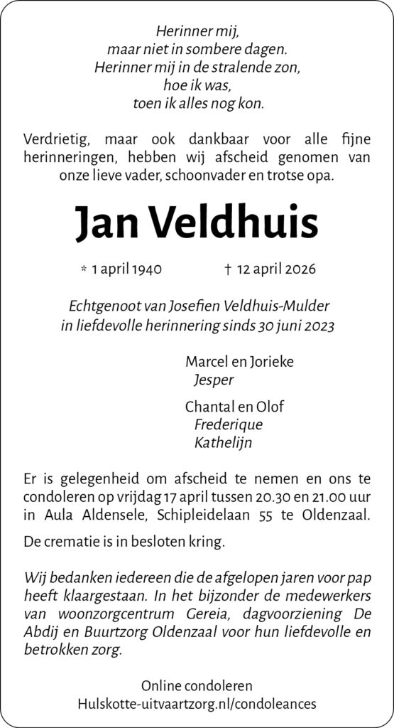Jan Veldhuis Uw condoleance Uw condoleance Uw naam (vereist) Uw e-mail adres (vereist) Uw condoleance (vereist)